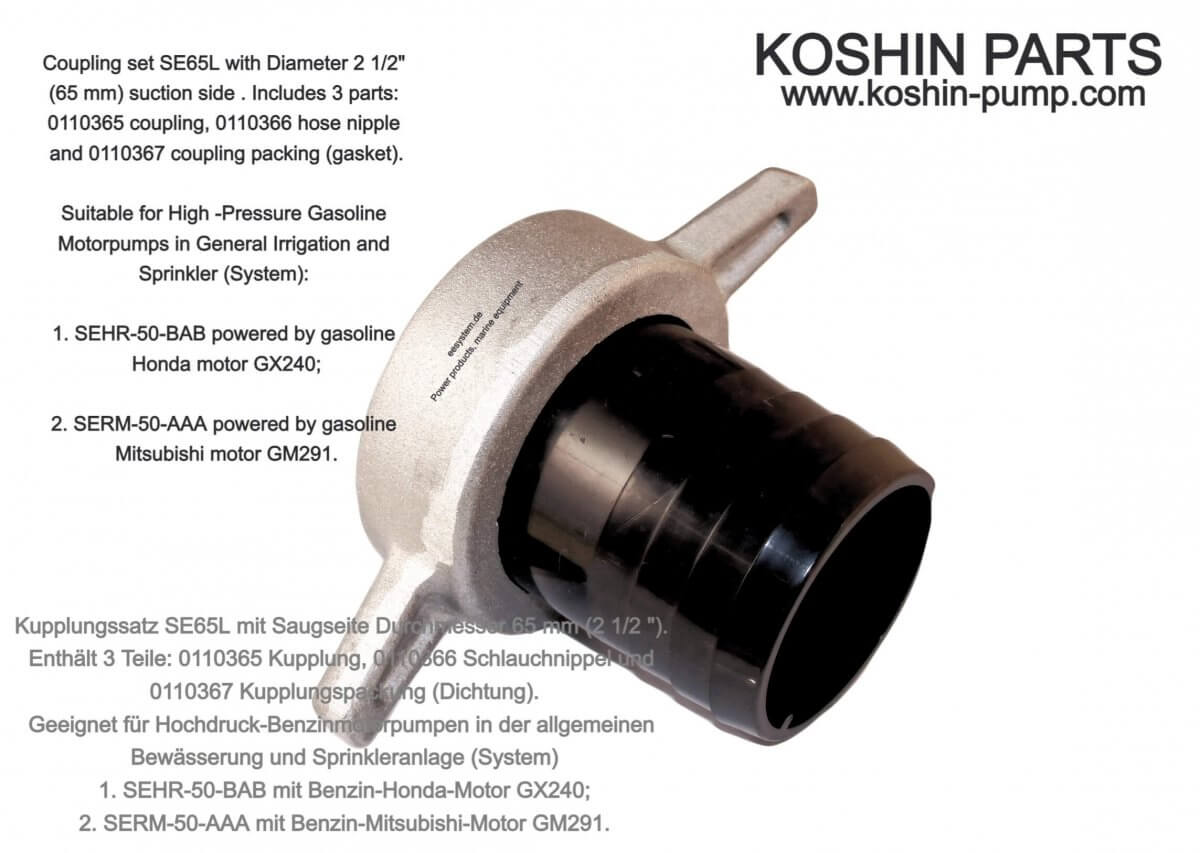 KOSHIN koppelingsset 65 mm 0118017 Koppelingsset SE65L met zuigzijdige diameter 65 mm (2 1/2 “). Bevat 3 onderdelen: 0110365 koppeling, 0110366 slangnippel en 0110367 koppelingspakking (afdichting). Geschikt voor hogedrukpompen met benzinemotor in algemene irrigatie- en beregeningssystemen 1. SEHR-50-BAB met benzinemotor Honda GX240; 2. SERM-50-AAA met benzinemotor Mitsubishi GM291. Origineel onderdeel van Koshin