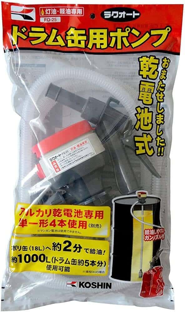 Praktische kunststof zelfaanzuigende elektrische pomp met batterijen KOSHIN “RAKU-AUTO” FQ-25 is een zeer eenvoudig en praktisch apparaat voor dagelijks gebruik thuis en in de garage. Om vloeistof van het ene vat naar het andere te pompen, moet de pomp verticaal in een vat worden geïnstalleerd zodat de aanzuigbuis naar beneden is gericht in het vat met de te verpompen vloeistof. De inlaat moet in de richting van het vat wijzen. Zet de schakelaar op de pomphendel in de stand ON. Er wordt vloeistof verpompt zolang je de vulhendel ingedrukt houdt of de pomp uitschakelt. Om de pomp voortijdig te stoppen, zet je de schakelaar op de pomphendel in de stand OFF.